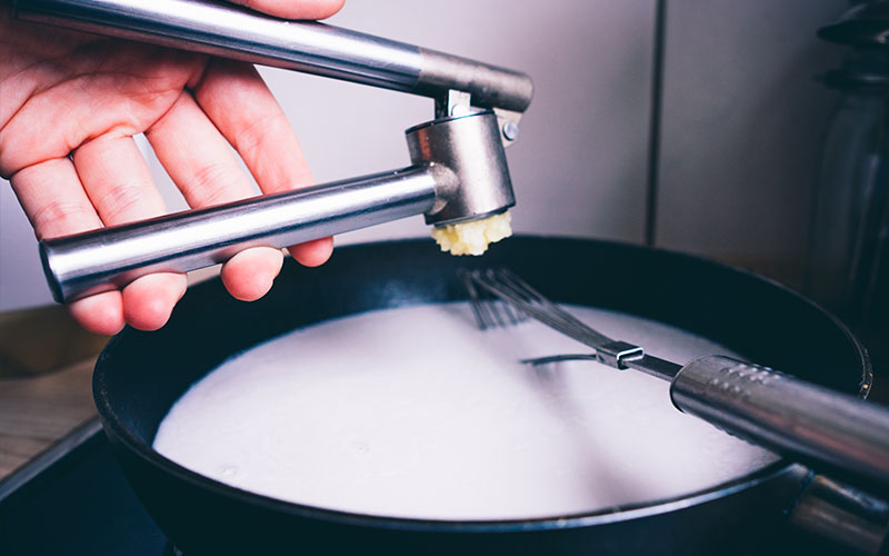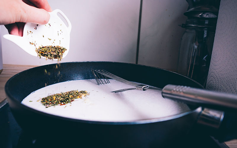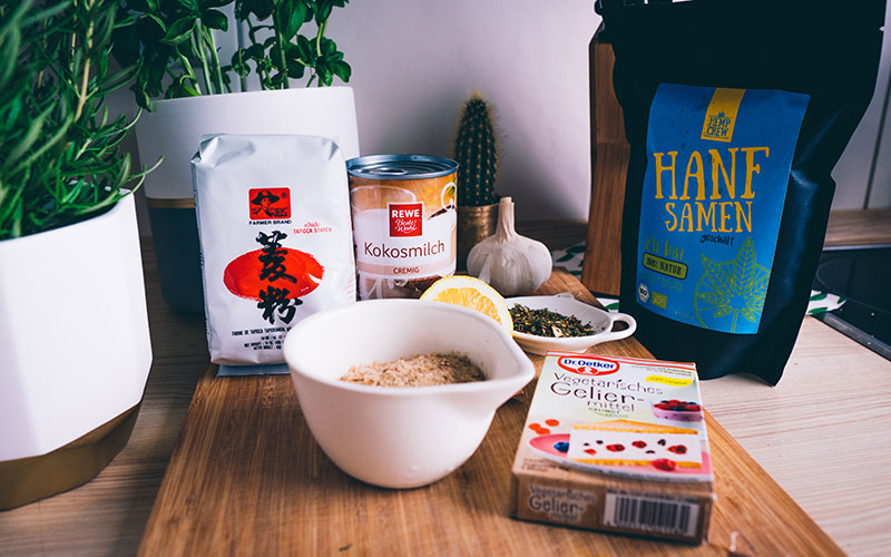 Zuerst bereitest du eine Glasform vor, in die später der Käse kommen soll. Öle sie ordentlich ein. Gib danach die Kokosmilch und das heiße Wasser in eine Pfanne. Unter Rühren gibst du nun alle anderen Zutaten hinzu: Hanfsamen (die gibts zum Beispiel von Hempcrew auf Amazon: , Hefeflocken, Agar Agar, Tapiokamehö, Zitronensaft, getrocknete Kräuter, Knoblauch und Olivenöl. Kleiner Tipp von Muddi: Damit das Mehl nicht klumpt, kannst du es vorher vorsichtig mit wenig Wasser anrühren, bis eine dickflüssige, gleichmäßige Masse entsteht. Der Trick hat schon die ein oder andere Mehlschwitze gerettet. Temperatur auf volle Pulle bis alles anfängt zu köcheln und immer kräftig rühren! Wenn alles einmal aufgekocht ist, lassen wir alles noch bei niedriger Temperatur ca. 5-6 Minuten köcheln, bis eine cremige Masse entsteht.